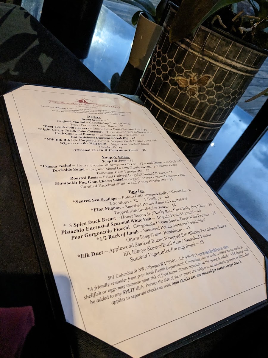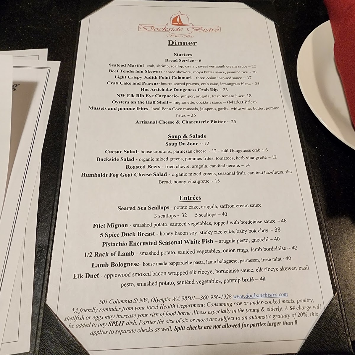 Welcome to Dockside Bistro & Wine Bar, a charming gem nestled in Olympia, WA. Known for its delectable seafood, the menu features a selection of dishes that are both fresh and innovative. Start your meal with the Soup Du Jour or indulge in a vibrant Humboldt Fog Goat Cheese Salad, enhanced by seasonal fruits and candied hazelnuts.